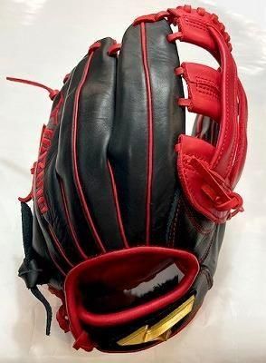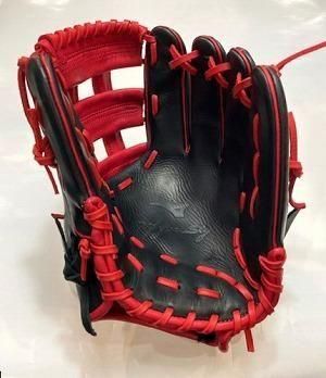 グローブ本体は、ブラックでウェブ、革紐、ハミダシがレッドです。